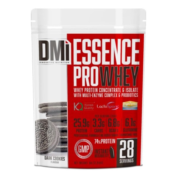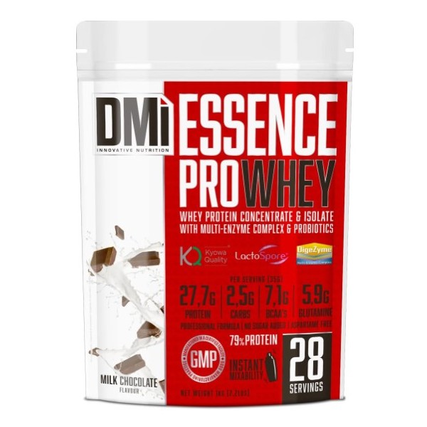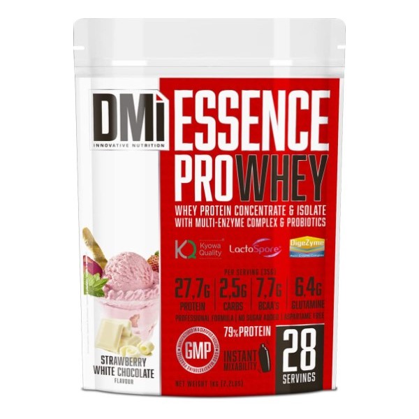 Essence Pro Whey de DMI Innovative Nutrition es un suplemento en polvo que contiene una mezcla proteica de alta calidad de concentrado de proteína de suero y aislado de proteína de suero complementada con L-glutamina (Kyowa Quality®), la mezcla de enzimas digestivas DigeZyme® (amilasa, proteasa, lipasa, lactasa, celulasa) y el complejo probiótico LactoSpore® (Bacillus coagulans).