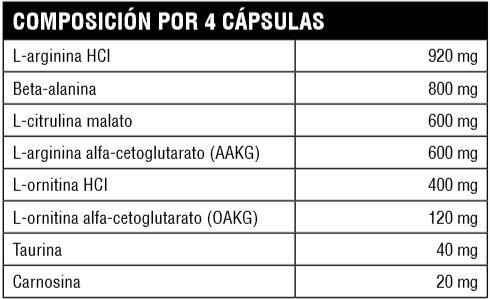L-arginina HCl, beta alanina, citrulina malato, arginina alfa ceto-glutarato (AAKG), ornitina HCl, ornitina alfacetogluratato (OAKG), taurina, carnosina y antiaglomerantes (dióxido de silicio y carbonato de magnesio).