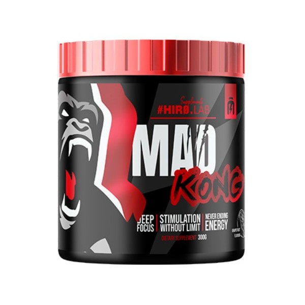 Mad Kong de #Hiro.Lab es un suplemento en polvo que contiene el pre-entreno más potente que combina teacrina, sinefrina, teobromina, citrulina, arginina y beta-alanina para ayudarte a aumentar la resistencia, la concentración mental y la energía, proporcionándote una excepcional estimulación solo aconsejable para deportistas ambiciosos y experimentados.