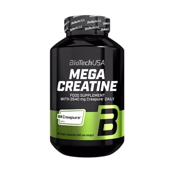 Mega Creatine de BioTech USA es un suplemento en cápsulas a base de monohidrato de creatina Creapure®, la creatina más reconocida a nivel mundial.