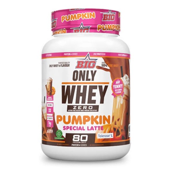 Only Whey™ Zero Pumpkin Special Latte de Big Nutrition es un suplemento en polvo que contiene el 100% de concentrado de proteína de suero Lacprodan® SP-8011V Instant, enriquecida con Tolerase L-Lactasa® para mejorar significativamente la digestión de la lactosa contenida en el suero, y doblemente edulcorada con Stevia y Splenda®.