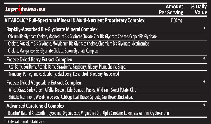 El resultado es Vitabolic: un complejo súper nutriente altamente concentrado y bioquímicamente activo que barre de un plumazo todos esos multivitamínicos genéricos, aburridos y sin potencia.