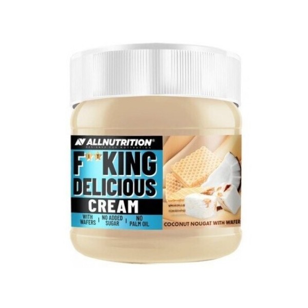 Fitking Delicious Cream Coconut Nougat with Wafers de AllNutrition es una deliciosa crema de turrón de copos de coco y trocitos de barquillo extremadamente dulce y sabrosa, elaborada sin azúcares añadidos y sin aceite de palma.