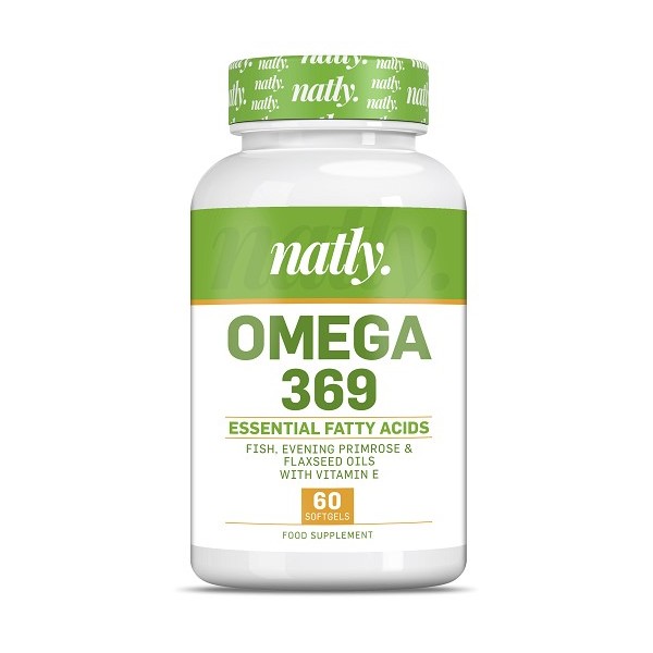 Omega 369 de Natly Nutrition es un suplemento en perlas a base de aceite de pescado rico en ácidos grasos Omega-3, aceite de onagra, aceite de lino y vitamina E.
