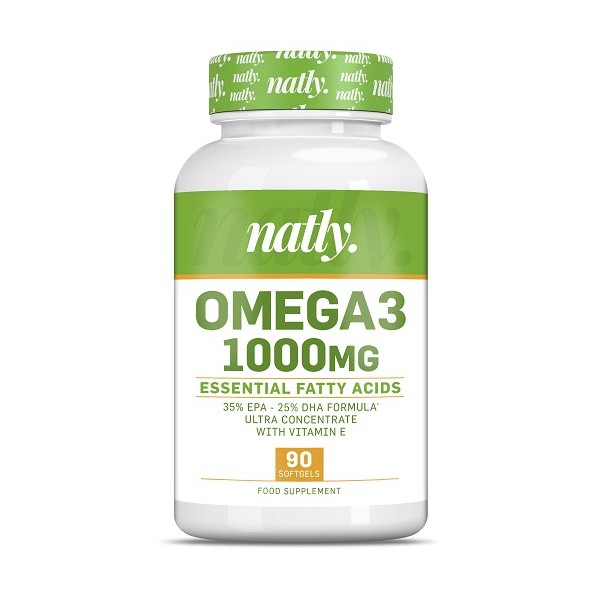 Omega 3 1000 mg de Natly Nutrition es un suplemento en perlas a base de aceite de pescado rico en ácidos grasos Omega-3 y vitamina E.