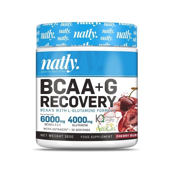 Premium BCAA+G Recovery de Natly Nutrition es un suplemento en polvo con delicioso sabor a cereza que contiene una avanzada y ultra concentrada fórmula anticatabólica a base de 6 g de aminoácidos ramificados de la máxima pureza con un ratio 2:1:1, 4 g de L-Glutamina (Kyowa Quality®), vitamina B6 y AstraGin® para favorecer la síntesis de proteínas, mejorar la absorción y eficacia de todos los ingredientes.