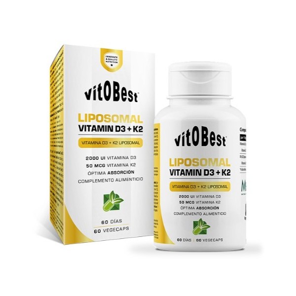 Liposomal Vitamin D3+K2 de Vitobest es un suplemento en cápsulas vegetales que combina la acción sinérgica de la D3 y la K2 para fortalecer huesos y defensas, proteger el corazón y asegurar una absorción superior gracias a su tecnología liposomal.