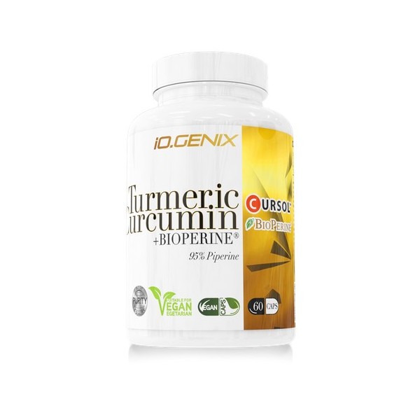 Turmeric Curcumin + BioPerine de IO.Genix es un suplemento en cápsulas vegetales que contiene una combinación de extracto de raíz de cúrcuma patentado Cursol® y extracto de fruto de pimienta negra patentado Bioperine®.