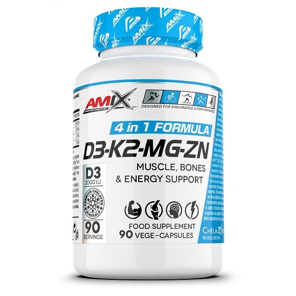 D3-K2-Mg-Zn de Amix™ Nutrition es un suplemento en cápsulas vegetales que combina las vitaminas D3 y K2 con minerales esenciales como magnesio y zinc en forma quelada (ChelaZone®).