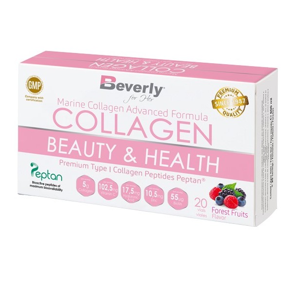 Collagen Beauty & Health de Beverly Nutrition es un suplemento en formato de viales líquidos de rápida asimilación que a base de colágeno marino Peptan®, vitamina C, ácido hialurónico, zinc y biotina que ha sido desarrollado para para ayudarte a mantener una piel joven, cabello y uñas fuertes, y articulaciones saludables.