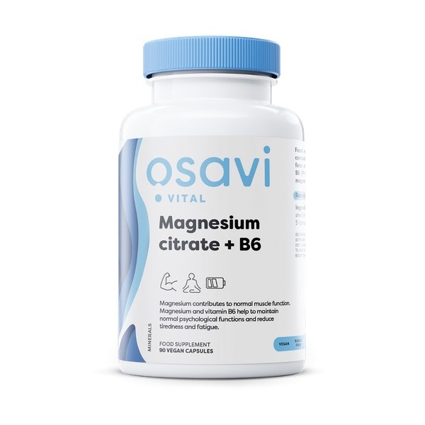 Magnesium Citrate + B6 de Osavi es un suplemento en cápsulas veganas que contiene magnesio en forma altamente absorbible de citrato de magnesio y vitamina B6 como piridoxal 5'-fosfato, que favorece la absorción de magnesio.