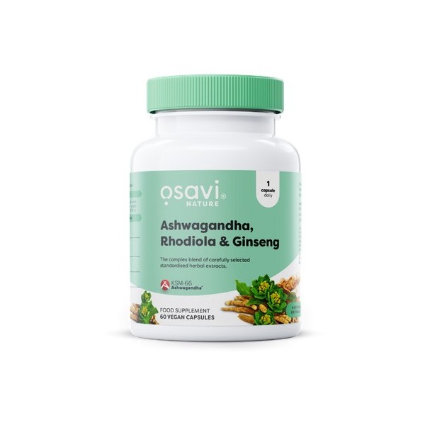 Ashwagandha Rhodiola & Ginseng de Osavi es un suplemento en cápsulas vegetales que contiene una combinación de extractos estandarizados de raíces de ashwagandha (KSM-66® Ashwagandha), rodiola, ginseng coreano y ginseng siberiano.