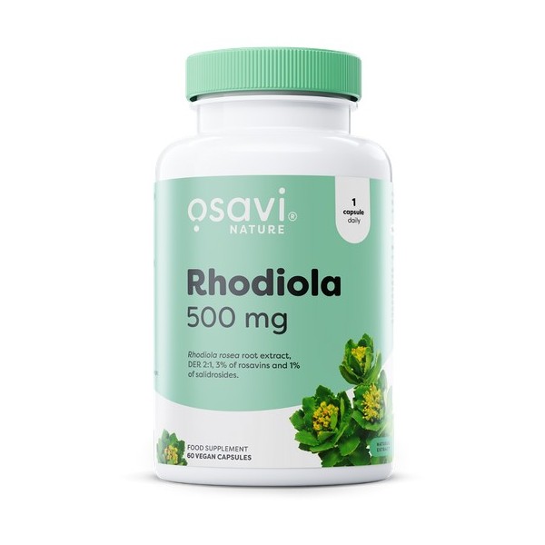 Rhodiola 500 mg de Osavi es un suplemento en cápsulas vegetales a base de extracto de raíz de rodiola estandarizado para un 3% de rosavinas y un 1% de salidrósidos.