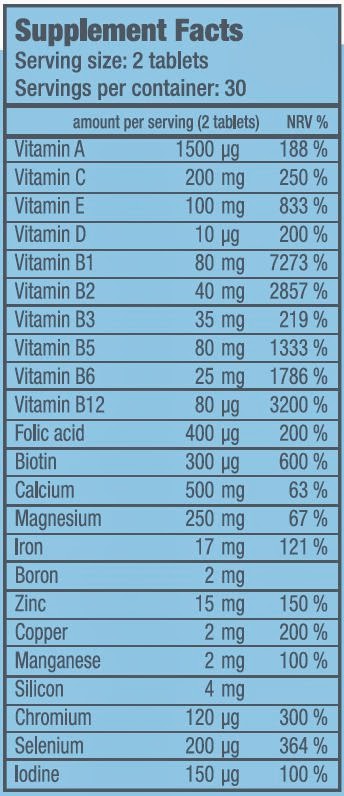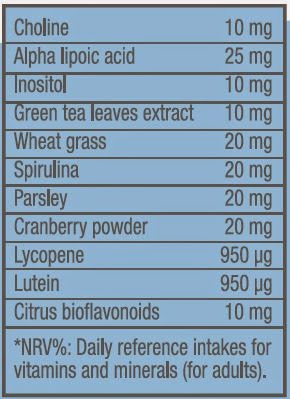 Fosfato dicálcico, Óxido de magnesio, Ácido ascórbico, Acetato de DL-alfa-tocoferol, Celulosa microcristalina (Agente(s) de volumen), Hidroxipropilmetilcelulosa (Agente(s) de volumen), Mononitrato de tiamina, Piridoxina hidrocloruro, D-calcio pantotenato, Riboflavina, Fumarato de hierro, Boro, Ácido cítrico, Niacinamida, Estearato de magnesio (Agentes antiadherentes), Ácido esteárico (Agentes antiadherentes), Bitartrato de colina, Citrus aurantium, Ácido alfa lipoico, trigo candeal, Espirulina, perejil (Petroselinum crispum), Arándano rojo, Óxido de zinc, Acetato de retinilo, Inositol, hojas de té verde, Dióxido de silicio, Sulfato de cobre, Manganeso (sulfato de manganeso), Colecalciferol, Licopeno, luteína, cloruro de cromo, Selenito de sodio, Ácido Fólico, Biotina, Yoduro de potasio, Cianocobalamina.