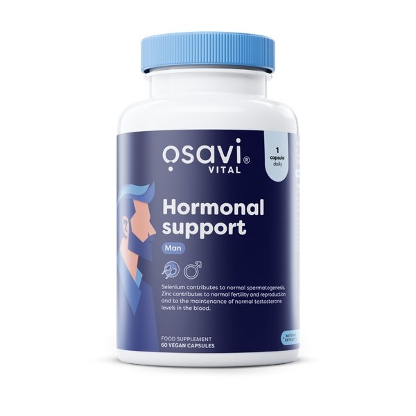Hormonal Support Man de Osavi es un suplemento en cápsulas vegetales que contiene una fórmula de apoyo hormonal para hombres con una mezcla única de extractos herbales de fruto de Tribulus Terrestris (estandarizado al 90 % de saponinas), KSM-66® extracto de raíz de Ashwagandha (estandarizado al 5% de withanólidos), extracto de corteza de pino marítimo (estandarizado para proantocianidinas oligoméricas) y selenio Selenium SeLECT® y zinc OptiZinc®.