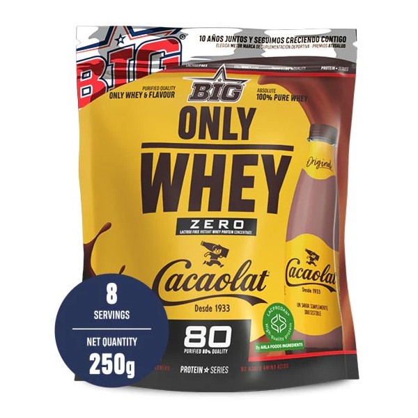 Only Whey™ Zero Cacaolat de la línea Big de Universal McGregror es un suplemento en polvo que contiene el 100% de concentrado de proteína de suero Volactive® Ultrawhey 80 instant, enriquecida con Tolerase L-Lactasa® para mejorar significativamente la digestión de la lactosa contenida en el suero, y doblemente edulcorada con Stevia y Splenda®.