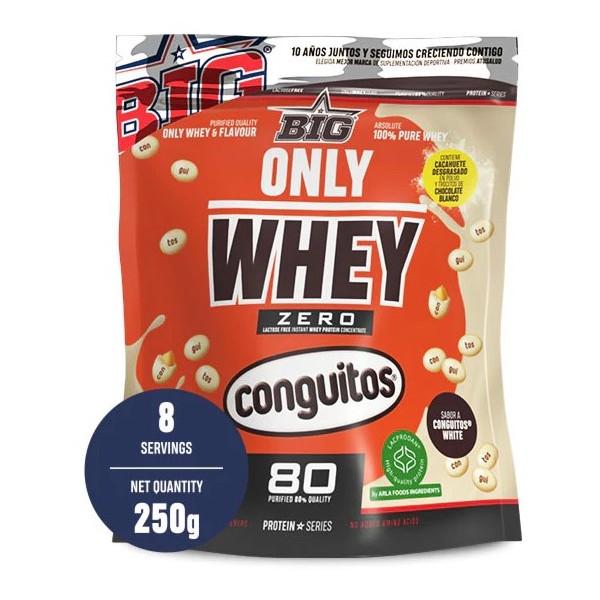 Descubre la nueva proteína Only Whey™ Zero Conguitos® fruto de una nueva colaboración de Big® y Lacasa®. Disfruta ya del genuíno sabor que te acompañó durante toda tu infancia ¡con polvo de cacahuete desgrasado y trozos de chocolate!, ahora disponible por tiempo limitado en su sabor ORIGINAL y en versión WHITE en la proteína de concentrado de suero 80% de la casa. Un auténtico Best Seller que ha ido evolucionando en su elaboración y pureza desde su primer lanzamiento en 2014.