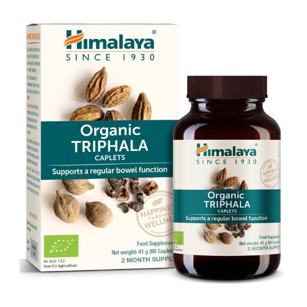 Organic Triphala de Himalaya es un suplemento en cápsulas que contiene una mezcla de mirobálano chebúlico orgánico en polvo y extracto orgánico de triphala: amla (fruto), mirobálano belérico (fruto), mirobálano chebulico, diseñado para la limpieza de colon y suplemento digestivo para el estreñimiento ocasional.