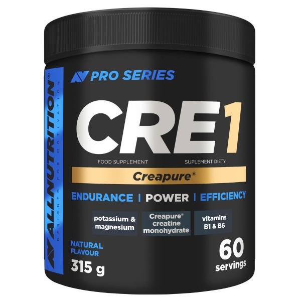 Cre 1 Creapure de AllNutrition es un suplemento en polvo que contiene una fórmula avanzada con monohidrato de creatina Creapure®, potasio, magnesio, tiamina y vitamina B6.