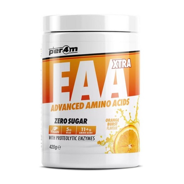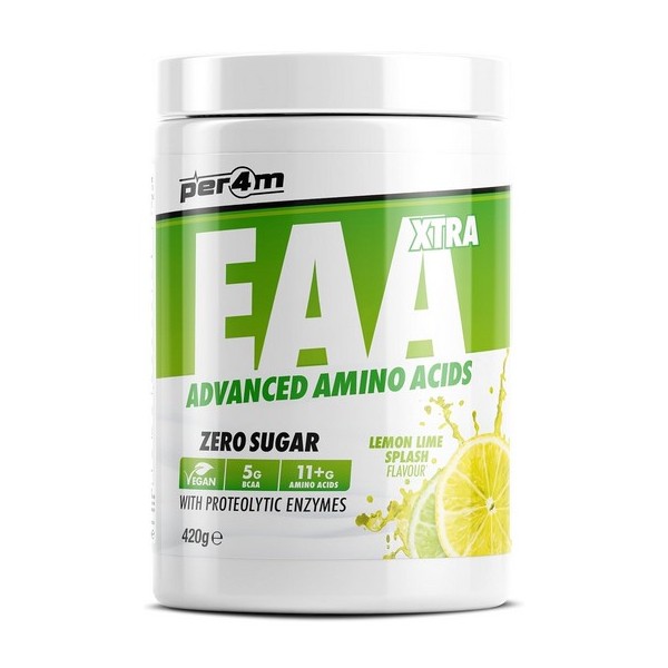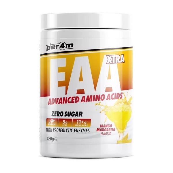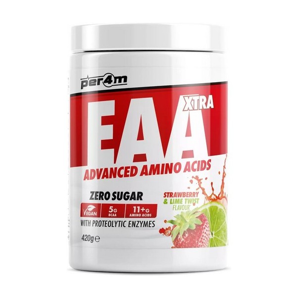 EAA Xtra Advanced Amino Acids de Per4m es un suplemento en polvo que proporciona 6.95 g de aminoácidos esenciales para favorecer la síntesis de proteínas musculares y promover la recuperación muscular.