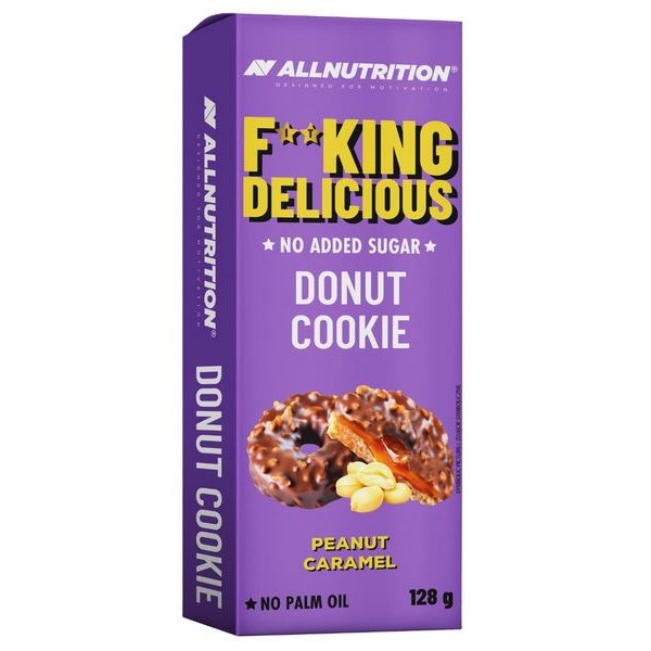 Fitking Delicious Donut Cookie Peanut and Caramel de AllNutrition son unas deliciosas galletas crujientes cubiertas de chocolate con leche y trocitos de cacahuete, rellenas de irresistible caramelo, elaboradas sin azúcares añadidos ni aceite de palma.