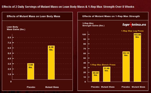 En un estudio clínico de 8 semanas para construcción muscular, un grupo de investigadores ensayaron una fórmula experimental idéntica a Mutant Mass ¡y se sorprendieron de su capacidad para propiciar ganancias significativas en el tamaño muscular y en la fuerza! Los sujetos participantes que usaron esta fórmula dos veces al día en sus programas de entrenamiento experimentaron significativas ganancias en la creación de masa muscular sin grasa y en la fuerza. ¡Los investigadores incluso constataron aumentos significativos en el tamaño muscular directamente en sus pectorales, brazos y piernas! ¡Lo mejor es que ganaron toda esa masa sin ganar apenas grasa!