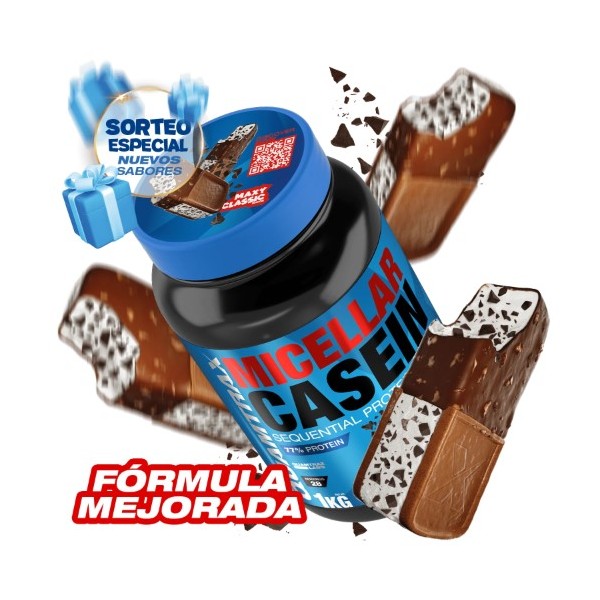 Ahora con el sabor más irresistible Micellar Casein Maxy Classic que recuerda al famoso helado con sabor a nata, con trocitos de chocolate y galleta.
