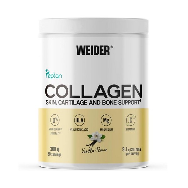 Collagen de Weider es un suplemento en polvo a base de péptidos de colágeno (Peptan®), magnesio, ácido hialurónico y vitamina C, diseñado para estimular la producción del colágeno ayudando a regenerar huesos y cartílagos.