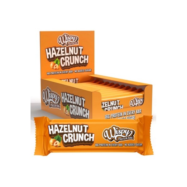 Wispy Protein Bar Hazelnut Crunch de Wispy Nutrition son unas deliciosas barritas altas en proteína con una irresistible cobertura de chocolate con leche y un sabor que no te dejará indiferente.