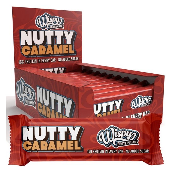 Wispy Protein Bar Nutty Caramel de Wispy Nutrition son unas deliciosas barritas altas en proteína con una irresistible cobertura de chocolate con leche y un sabor que no te dejará indiferente.