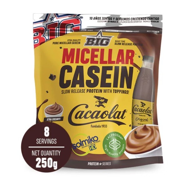 Micellar Casein Cacaolat de Big es un suplemento proteico en polvo que contiene caseína micelar de la más alta calidad hecha a base de Lacprodan® de Arla® Foods Ingredients, elaborada a partir de suero lácteo fresco y nutricionalmente equilibrado.