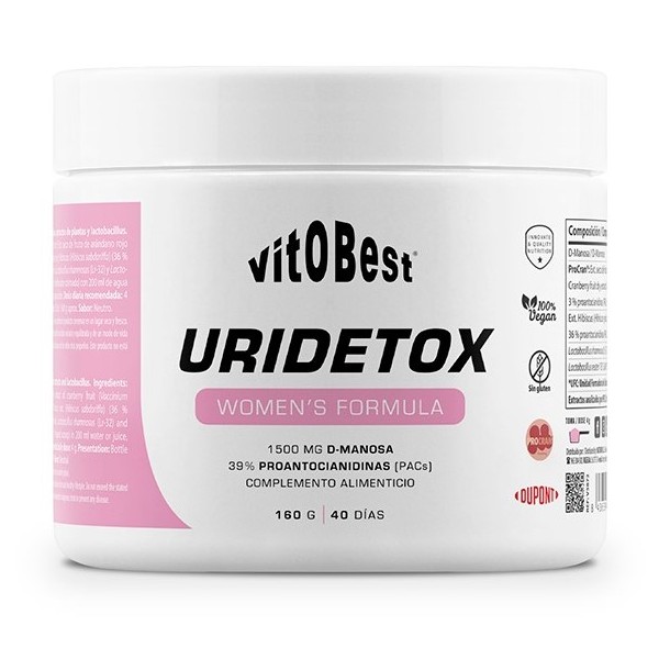 UriDetox de Vitobest es un suplemento en polvo diseñado para prevenir y tratar infecciones urinarias especialmente en mujeres, con una fórmula integral avalada por ingredientes clínicamente respaldados.