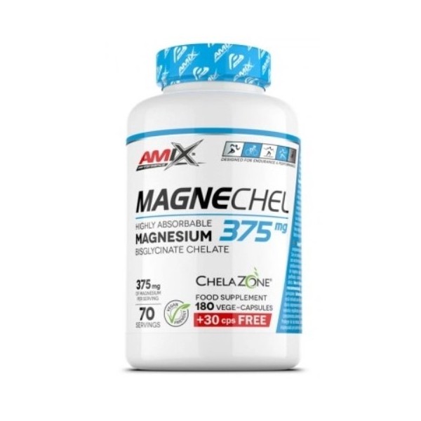 MagneChel® de Amix™ Nutrition es un suplemento en cápsulas vegetales que proporciona 375 mg de magnesio como bisglicinato quelado de magnesio ChelaZone®, una forma de magnesio altamente absorbible con la más alta biodisponibilidad.