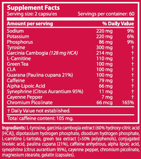 L-tirosina, extracto de garcinia cambogia, (60% ácido hidroxi-cítrico (HCA), fosfato de hidrógeno dipotásico, fosfato de hidrógeno disódico, L-carnitina, L-tartrato, extracto de té verde (>50% polifenol), ácido linoleico conjugado, paulina cupana (21%), cafeína anhidro, ácido alfa lipóico, sinefrina (citrus aurantium 95%), cayena, picolinato de cromo, estearato de magnesio, gelatina (cápsulas).
