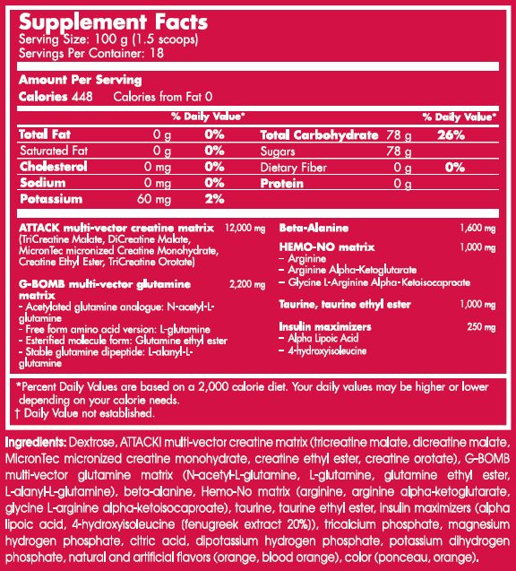 Dextrosa, ATTACK! Matriz creatine multi vector (tricreatina malato,dicreatina malato, MicronTec monohidrato de creatina de granos micronizados;creatina etilo éster;creatina orotato), G Bomb-matriz de multi-vector de glutamina (N-Acetil L-glutamina , L-glutamina, glutamina-etil-éster, L-alanyl-L-glutamina), beta-alanine; matriz Hemo NO ( arginine, arginina-alfa-ketoglutarato, glicina L-arginina-alfaketoisocaproato) taurina, taurina etil-éster, lipoic acid, 4-hydroxileucina, fosfato tricálcico, magnesio fosfato de hidrógeno, ácido cítrico, fosfato dipotasio de hidrogeno, fosfato dihidrogenado de potasio, aromas naturales y artificiales (naranja, naranga sanuínea), color (ponceau, naranja).