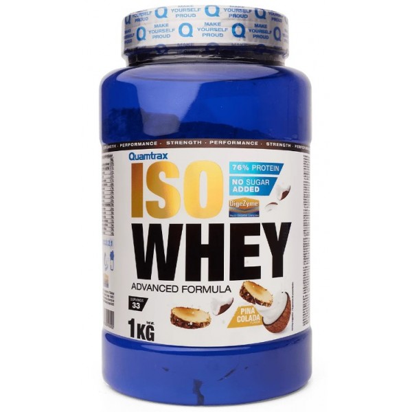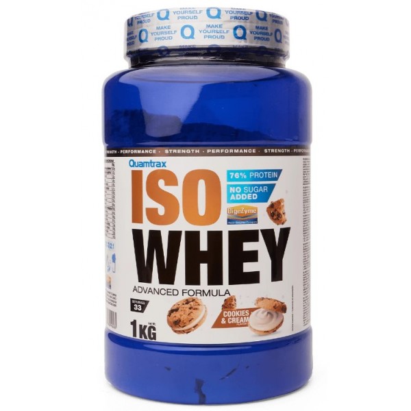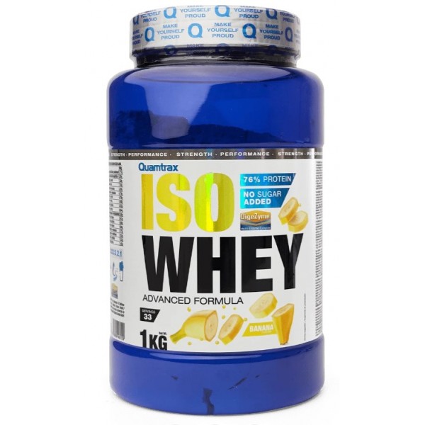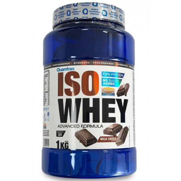 IsoWhey de Quamtrax Nutrition es un suplemento proteico en polvo que contiene una mezcla de aislado y concentrado de suero de leche obtenido por microfiltración de flujo cruzado, un proceso por el que se consigue una proteína que mantiene un valor biológico muy alto, pero con unas bajas concentraciones de lactosa, grasa y carbohidratos.