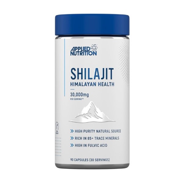 Shilajit de Applied Nutrition es suplemento en cápsulas que proporciona 750 mg de extracto puro de Shilajit (20:1), equivalente a 30.000 mg de Shilajit crudo, estandarizado al 60% de ácido fúlvico.