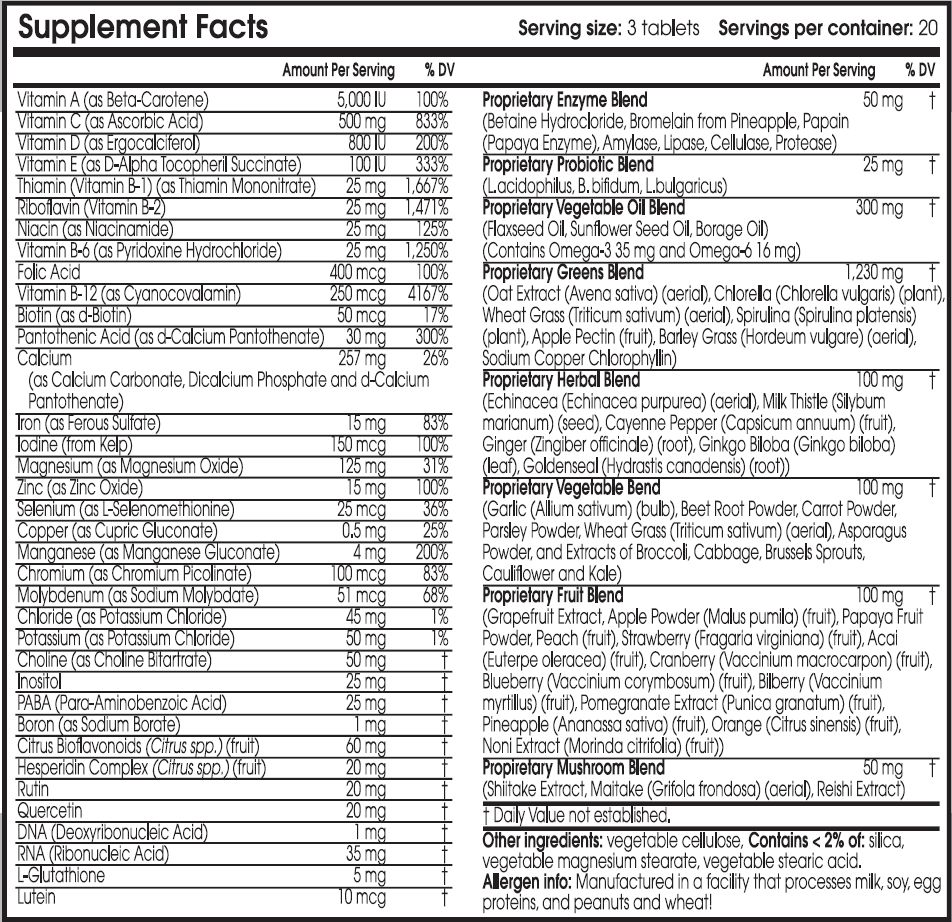 Por servicio: Vitamina A (Beta-Carotene) 5.000 IU; Vitamina C (Ácido Ascórbico) 500 mg; Vitamina D (Ergocalciferol) 800 IU; Vitamina E (D-Alpha Tocopheril Succinate) 100 IU; Tiamina (Vitamina B-1) (Thiamin Mononitrate) 25 mg; Riboflavina (Vitamina B-2) 25 mg; Niacina (Niacinamide) 25 mg; Vitamina B-6 (Pyridoxine Hydrochloride) 25 mg; Ácido Fólico 400 mcg; Vitamina B-12 (Cyanocovalamin) 250 mcg; Biotina (d-Biotin) 50 mcg; Ácido pantoténico (d-Calcium Pantothenate) 30 mg; Calcio (Calcium Carbonate, Dicalcium Phosphate y d-Calcium Pantothenate) 257 mg; Hierro (Ferous Sulfate) 15 mg; Yodo (de Kelp) 150 mcg; Magnesio (Magnesium Oxide) 125 mg; Zinc (Zinc Oxide) 15 mg; Selenio (L-Selenomethionine) 25 mcg; Cobre (Cupric Gluconate) 0,5 mg; Mangano (Manganese Gluconate) 4 mg; Cromo (Chromium Picolinate) 100 mcg; Molibdeno (Sodium Molybdate) 51 mcg; Chloride (Potassium Chloride) 45 mg; Potassium (Potassium Chloride) 50 mg; Bitartrato de colina (Choline Bitartrate) 50 mg; Inosita 25 mg; PABA (para-amino-ácido-benzóico) 25 mg; Boro (Sodium Borate) 1 mg; Bioflavonóides de cítricos (Citrus spp.) (fruta) 60 mg; Fruto de Hesperidina (Citrus spp.) (fruta) 20 mg; Rutina 20 mg; Quercetina 20 mg; ADN (ácido desoxirribonucléico) 1 mg; ARN (ácido ribonucléico) 35 mg; L-Glutation 5 mg; Ajo 10 mcg; Mezcla única de enzimas (Betadine hydrocoride, bromelain derivada de la Pi?a, Papain (Enzimas de Papaya) amylase, lipase, cellulace, protease) 50 mg; Mezcla única de prebióticos L-acidophilus, L.bifidus, L.bulgaricus) 25 mg; Mezcla de única de aceites vegetales (de los cuales: Omega3, Omega6) 300 mg; Mezcla única de vegetales (L.bifidus, L.bulgaricus, L-acidophilus ) 25 mg; Mezcla de única de aceites vegetales Oat extra(tos (avena sativa)(aerial), Leche de thistle (silybum marianum) (seed) pimienta Cayenne (Cacapsicum annum) (fruta) Ginger (Zingiber Olfficianale) (root) Ginkgo Biloba (leaf) Goldenseal (hydrastis candensis) (root) 1,230 mg; Mezcla única de hierbas medicinales (Echinacea (Echinacea purpurea) (aerial), Ginger (Zingiber officinale) (root), Leche de Thistle (Silybummarianum) (seed), pimienta Cayenne (Capsicum annuum) (fruta), Ginseng coreano (Panax ginseng) Ginkgo Biloba (Ginkgo biloba) (leaf), oldenseal (Hydrastis canadensis)(root)) 100 mg; Mezcla Única de frutas (Extracto de uvas, manzana en polvo (malus Pumila) (fruta) Polvos de fruta de papaya, Melocotón (fruta) Fresa (Fragaria Virginiata) (fruta) Acai (euterpe olerace) (fruta) Arándano agrio (vaccinum corymbosum) (fruta) Arándano (vaccinum corymbosum) (fruta) Extracto de granada (Punica granatum) (fruta) Pi?a (ananssa sativa) (fruta) naranja) (Citus sinensis) (fruta) Extracto de Noni (Morinda citrifolia) (fruta) 100 mg; Mezcla única de Seta (Shhitake extract, maitake (grifola frondosa) (aerail) extracto de Reishi 50 mg.