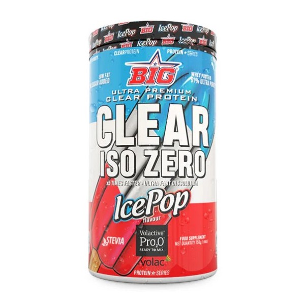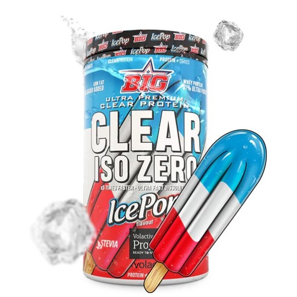 A mediados de 2023 empezaban a comercializarse las primeras proteínas claras, siendo hoy en día un producto totalmente asentado y una opción mas para el consumidor de suplementación profesional. BIG® ha logrado avanzar notablemente en términos de calidad e innovación respecto a sus competidores, presentando su gama de proteínas Clear Iso Zero con la patente exclusiva Volactive® Pro2O® Ready to Mix de Volac® y en una gama de sabores irrepetibles, comenzando por el nuevo ICEPOP, con refrescantes toques de lima, cereza y frambuesa azul.