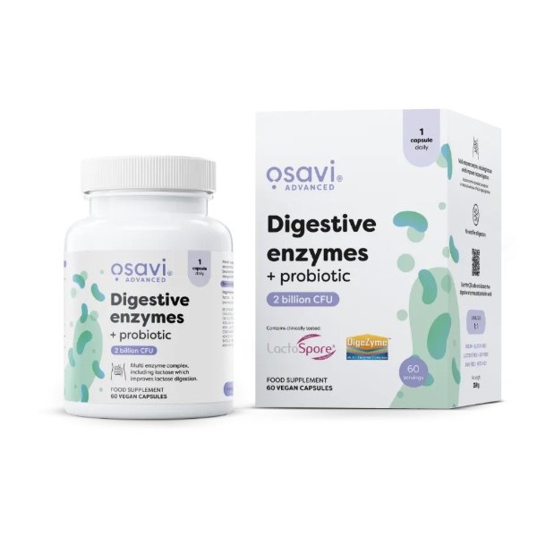 Digestive Enzymes + Probiotics de Osavi es un suplemento en cápsulas que contiene una fórmula única que combina ingredientes clínicamente estudiados: el probiótico estable LactoSpore® con el complejo enzimático digestivo DigeZyme®, complementados con las enzimas vegetales papaína y bromelina.