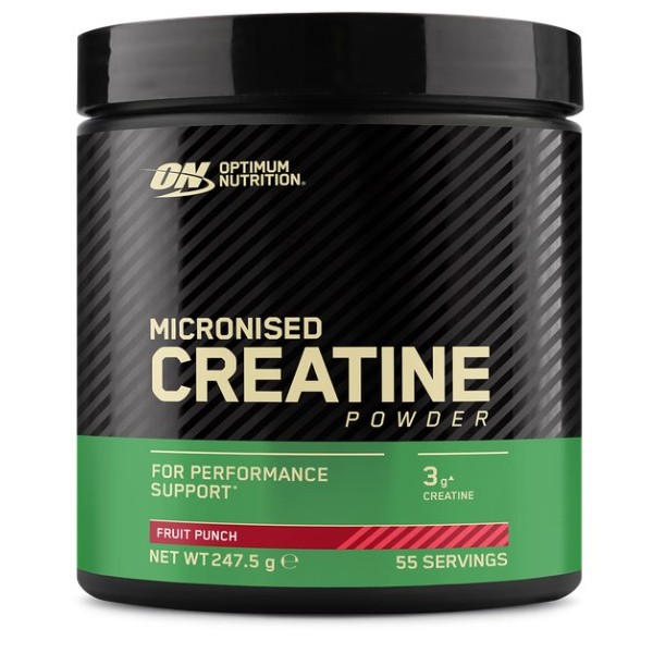 Micronised Creatine Powder de Optimum Nutrition es un suplemento en polvo que proporciona 100% creatina monohidrato micronizada de alta calidad con un delicioso y refrescante sabor a frambuesa azul, naranja o mezcla de frutas (fruit punch).