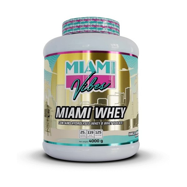 Miami Whey de Miami Vibes es un suplemento en polvo que contiene una fórmula premium de proteína pura de suero (aislada, concentrada e hidrolizada).
