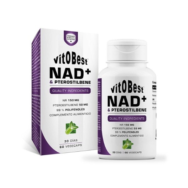 NAD+ & Pterostilbene de Vitobest es un suplemento en cápsulas vegetales que contiene una fórmula avanzada que combina cloruro de nicotinamida ribósido (NR), un precursor directo de NAD+, con pterostilbeno, un potente antioxidante natural perteneciente a la familia de los polifenoles.