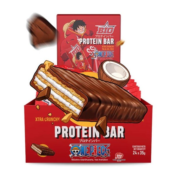 Protein Bar One Piece de Big Nutrition son unas deliciosas barritas proteicas estilo waffer disponibles en 2 sabores (coconut y vainilla yogurt), con un núcleo multi-layer de crujiente barquillo y deliciosa crema proteica, recubierta por un generoso baño del mejor chocolate con leche extrafino.