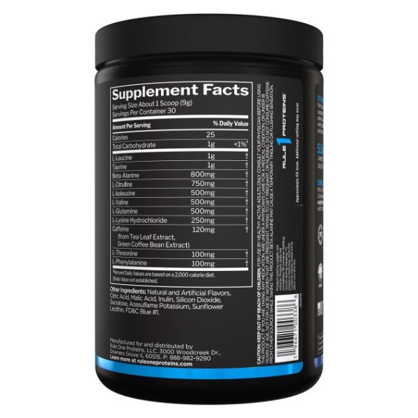L-leucina, Taurina, Beta-alanina, L-citrulina, L-isoleucina, L-valina, L-glutamina, Clorhidrato de L-lisina, Cafeína (procedente del extracto de hojas de té y del extracto de granos de café verde), L-treonina, L-fenilalanina, Aromas naturales y artificiales, ácido cítrico, ácido málico, inulina, dióxido de silicio, sucralosa, acesulfamo potásico, lecitina de girasol, azul FD&C nº 1.