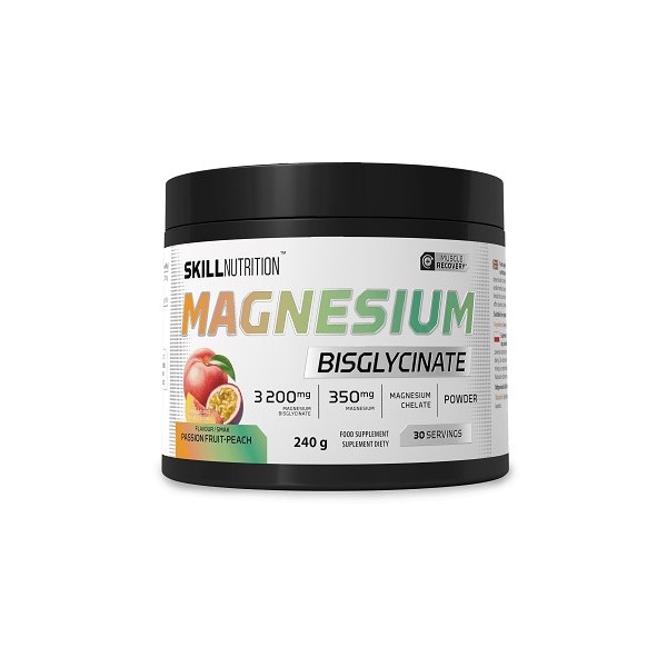 Magnesium Bisglycinate de Skill Nutrition es un suplemento dietético premium en polvo que proporciona 350 mg de magnesio elemental (93% del Valor de Referencia de Nutrientes) en la forma quelada más biodisponible y mejor tolerada del mercado.