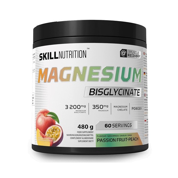 Magnesium Bisglycinate de Skill Nutrition es un suplemento dietético premium en polvo que proporciona 350 mg de magnesio elemental (93% del Valor de Referencia de Nutrientes) en la forma quelada más biodisponible y mejor tolerada del mercado.