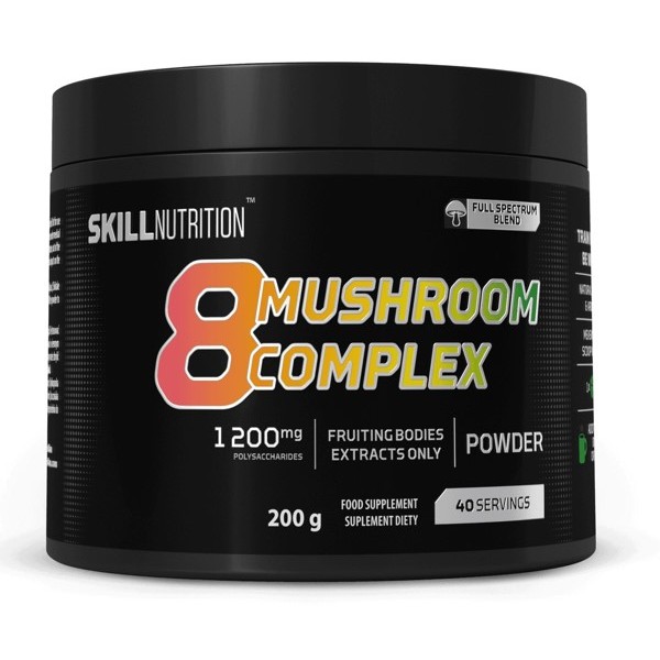 8 Mushroom Complex de Skill Nutrition es un suplemento dietético en polvo que combina extractos de los cuerpos fructíferos de 8 hongos cuidadosamente seleccionados y muy valorados desde hace mucho tiempo no solo por su sabor único, sino también por sus propiedades biológicas.