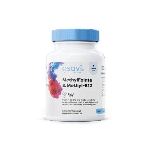 Methylfolate & Methyl-B12 de Osavi es un suplemento en cápsulas vegetales que contiene las formas bioactivas más eficaces de las vitaminas B, combinando Quatrefolic® (la cuarta generación de folato, directamente utilizable sin conversión enzimática), metilcobalamina (la forma activa de B12 con afinidad especial por el sistema nervioso) y vitamina B6 como P-5-P, de alta absorción.