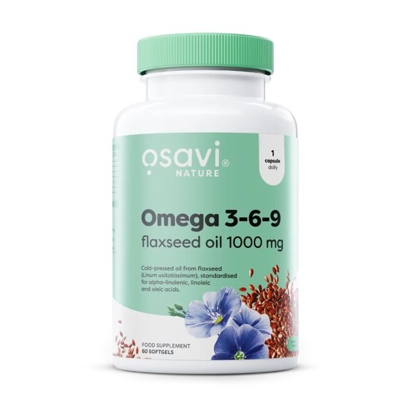 Omega 3-6-9 Flaxseed Oil 1000 mg de Osavi es un suplemento en perlas que contiene aceite de linaza prensado en frío altamente estandarizado 500 mg de ALA omega-3 con efecto antiinflamatorio demostrado, 110 mg de LA omega-6 esencial para la barrera cutánea y las membranas celulares, y 110 mg de OA omega-9 cardioprotector, restaurando el equilibrio omega-6/omega-3, reduciendo la CRP y los triglicéridos, y apoyando la salud cardiovascular, la piel y el sistema nervioso sin los eructos de pescado ni el origen animal de los aceites marinos convencionales.